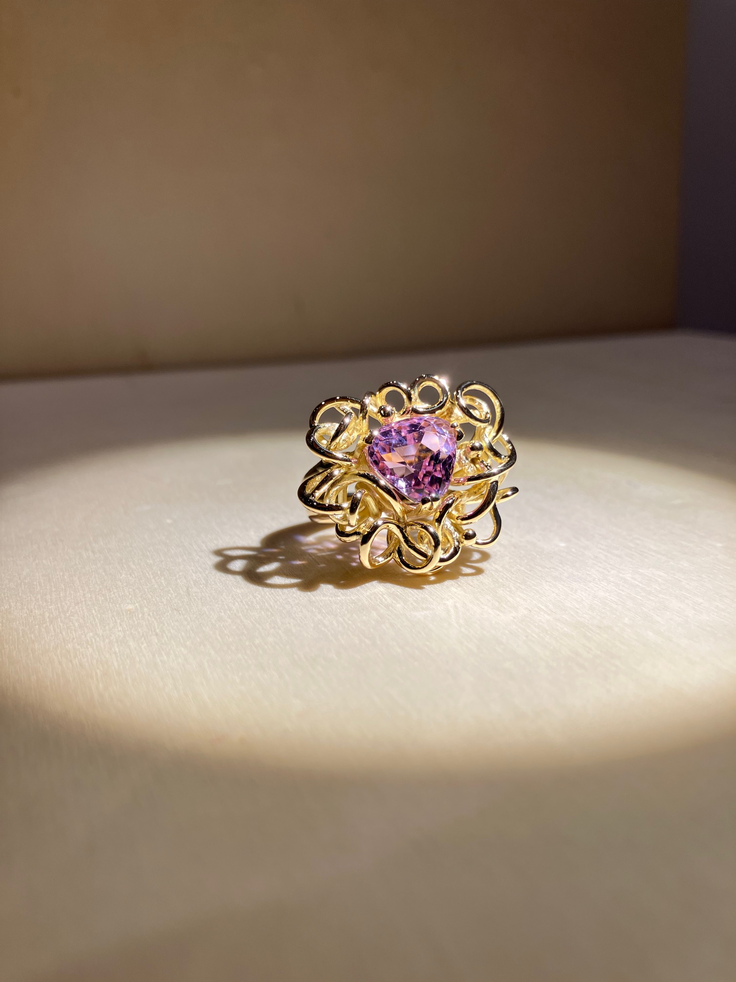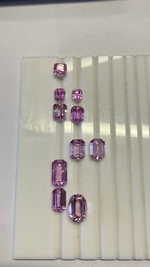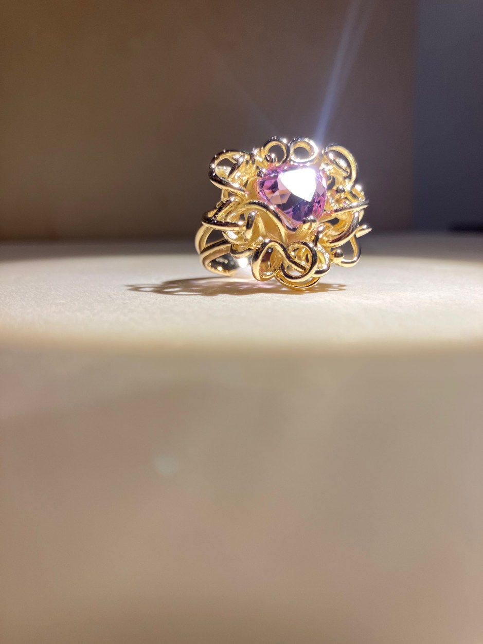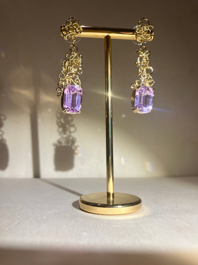 Questi orecchini sono per noi la precisa corrispondenza tra il suono e la forma, tra il suono e un colore, il colore è quello lontanissimo delle kunziti. Pietre di misteriosa bellezza, di tale pieno punto di rosa da rendere incredulo lo spettatore, nel loro brillio l’Afghanistan, che nulla ha a che vedere con il mondo di Luigi XIV, con il Barocco e i suoi protagonisti, eppure siamo certi una tale magnificenza di luce sarebbe stata certamente apprezzata anche in quel tempo, soprattutto da quel gusto.