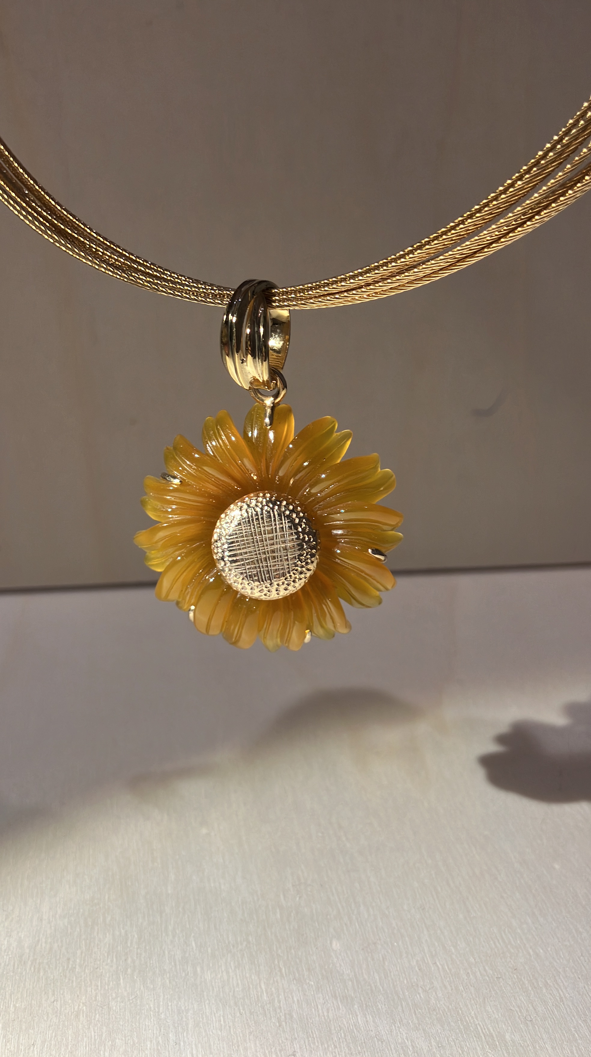 Di seguito un ciondolo costruito su richiesta del cliente che cercava un grande ciondolo a girasole da regalare. Partendo da una grande corolla di petali in agata naturale color miele abbiamo realizzato a mano la parte centrale e la struttura retrostante simulando in argento 925 dorato (galvanica oro giallo 18 carati) e appositamente “graffiato” il particolare effetto spugnoso del fiore. Cercando di trovare una chiave filologica per realizzare la contromaglia abbiamo deciso di confondere la parte meno naturalistica del ciondolo accostando tra loro foglie lunghe sempre in argento dorato che consentissero di inserire il ciondolo a piacere in un grande girocollo in argento dorato o in altri supporti.